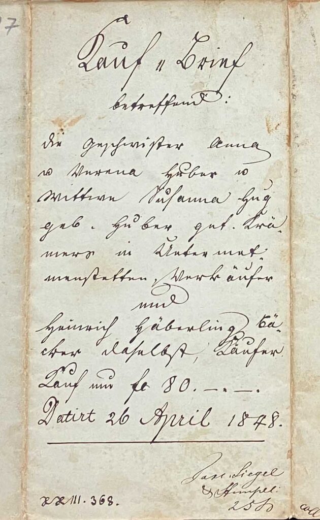 Der hiefür errichtet 75 fl Kaufschuldbrief ist von Martini 1847 an vier getilgt in fidem Prozent zu verzinsen aus Not. Canzler