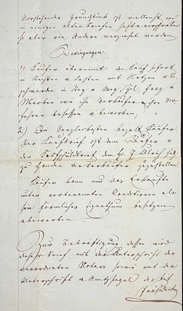 1.) Käufer übernimmt den Kauf sofort in Rechten u Lasten mit Netzen u beschwerden in Steg u. Weg zil, Haag u.