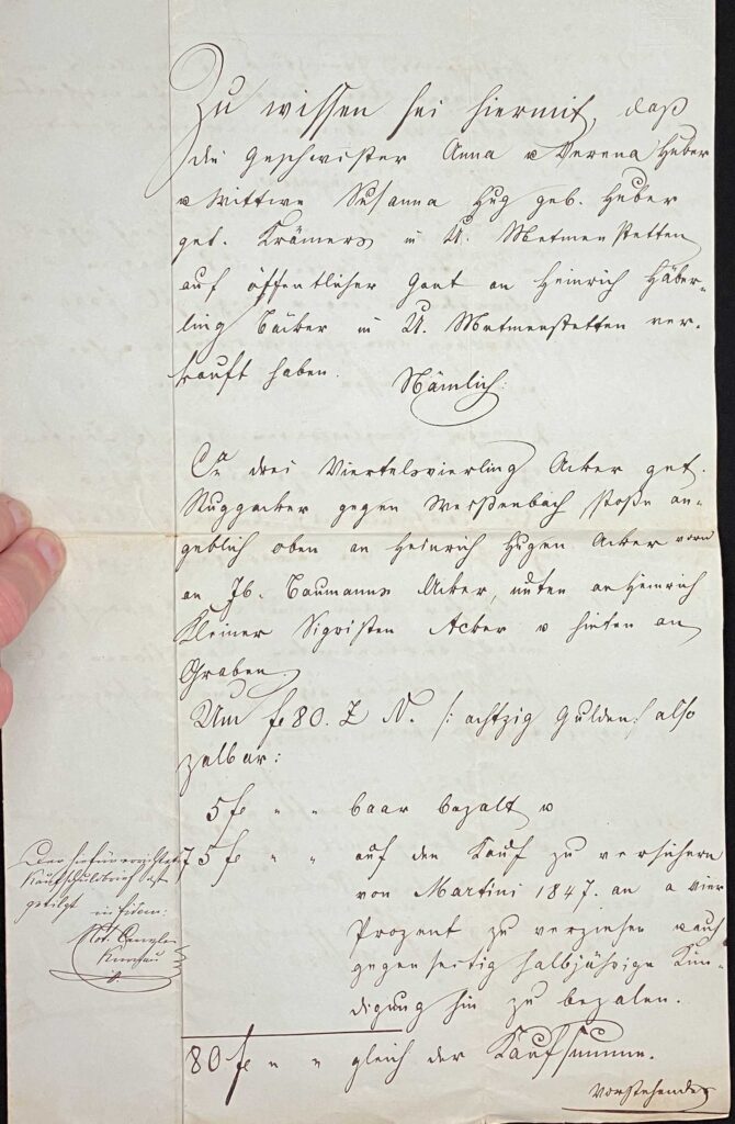 Um f. 80. Z. N. /: achtzig Gulden / also zalbar. 5 fl „ „ baar bezalt auf den Kauf zu versichern