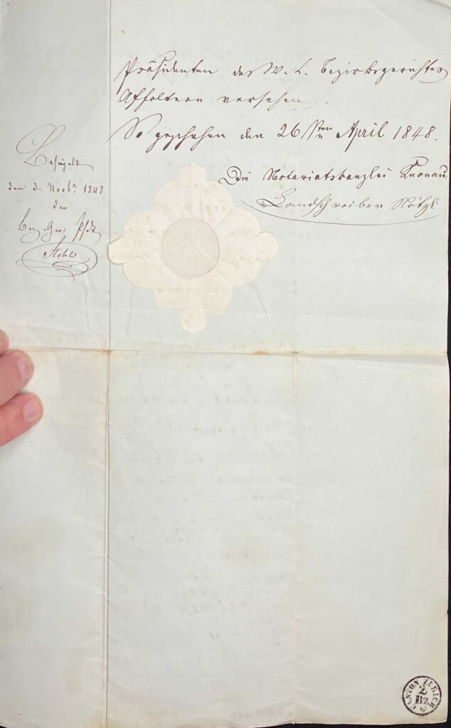 Besiegelt Die Notariatskanzlei Knonau den 3. Novbr. 1848.