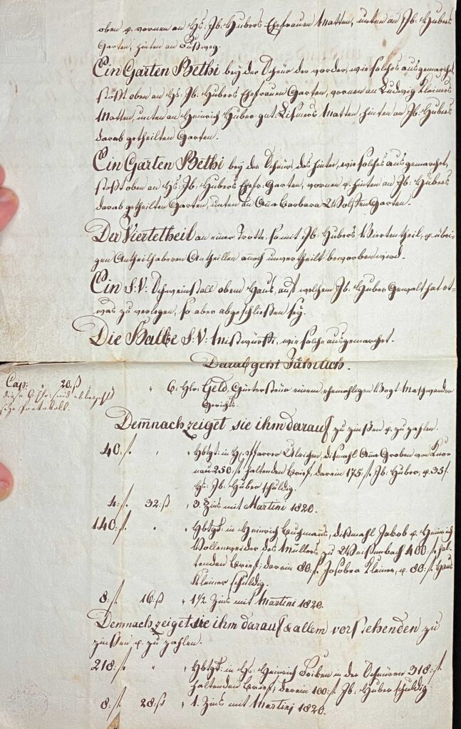 - Zins mit Martini 1820. 140: „Ybtgl. in Heinrich Laugmans, dißmahl Jakob v. Heinrich Vollenweider des Müllers zu Weißenbach 400. s. haltenden Brief; darein 80: fl. Josoben Kleiner, u. 80: s. Haus Kleiner schuldig. 8 t 16 ß „ 11/2. Zins mit Martini 1820. Demmach zeiget die ihm darauf & allem vorstehenden zu zinsen u. zu zahlen. „218: Hbtgt: in dHs: Heinrich Foiken in der Scheünen 318: ist haltenden Brief; darum 100: fl. Jb. Huber schuldig 28 ß.