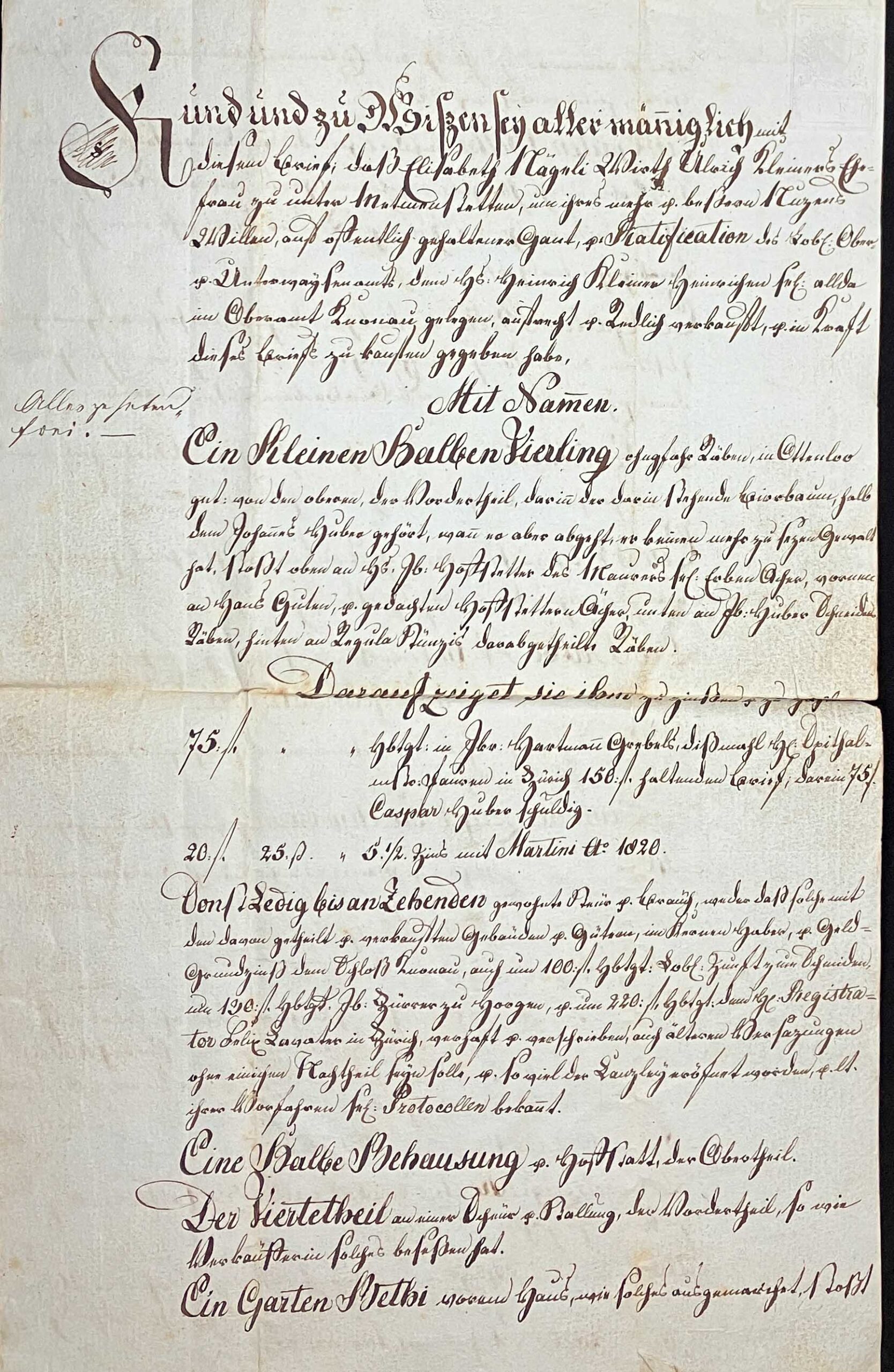 ihrer 4 Vorfahren sel. Protocollen bekannt. Eine Balbe Behausung v. Hoffstatt, der Obertheil. Der Viertetheil an einer dahrür u. Ballung, der Vordertheil, so wie Verkäußerin solches beseßen hat. Ein Garten Bethi vorend Haus, wie solches ausgemarchet, stoßt oben u. vornen an Hs: Jb: Hubers Ehefrauen matten, unter an Hb: H. Hubers Garten, hinten an Fußweg. Ein Garten Bethi bey der Scheün der wieder, wie solches ausgemersche stößt oben an Hs: Jb: Hubers Ehefrauen Garten, vornen an Ludwig Kleiners