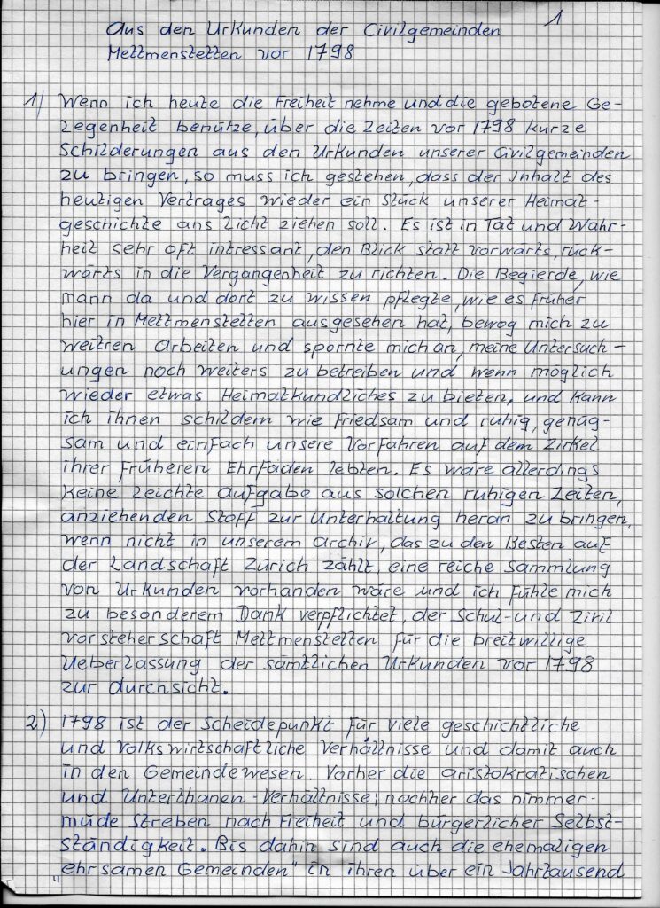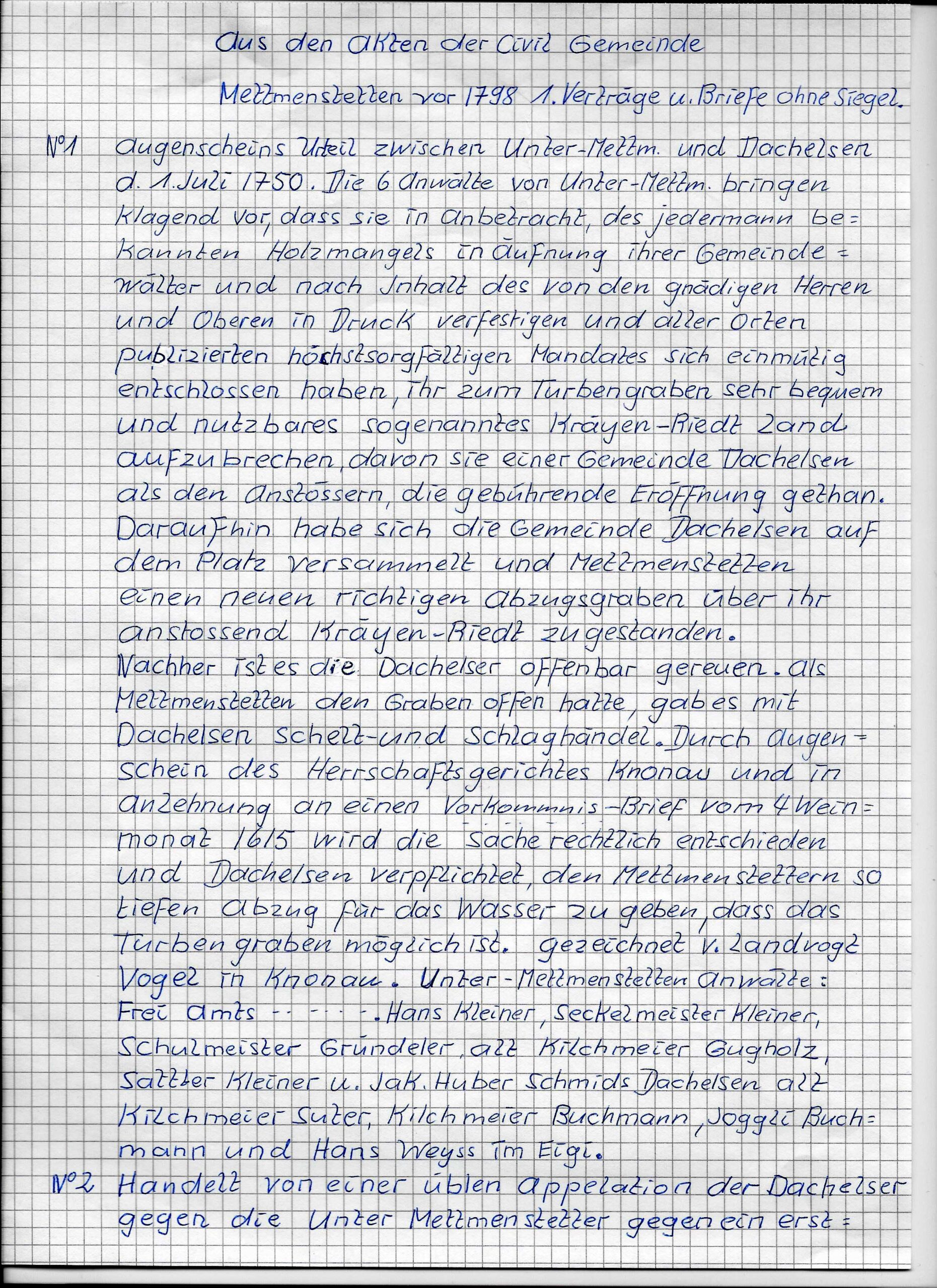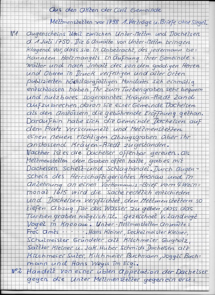 Aus den ££Urkunden der Civilgemeinde Mettmenstetten vor 1798. Übersetzt von alt Bezirksrichter Karl Funk. Original nicht mehr vorhanden.